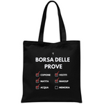 La "Borsa delle Prove" è il compagno ideale per attori che affrontano il backstage con autoironia. La grafica presenta una simpatica checklist, con voci come copione, vestiti, matita, makeup e acqua tutte spuntate, mentre "memoria" rimane ironicamente in sospeso. Questa borsa scherza sul classico dilemma di ogni attore: avere tutto pronto per le prove tranne la parte a memoria!