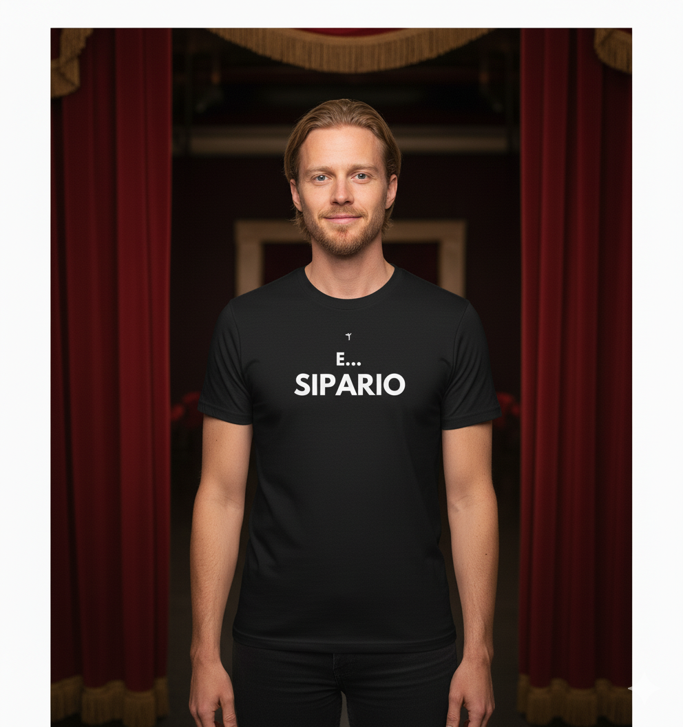 "E...sipario" è una semplice frase che racchiude l'attimo di suspense prima dell'inizio dello spettacolo. Con queste due parole, si evoca l'atmosfera carica di attesa e adrenalina che precede l’apertura del sipario. Un design essenziale, ma potente, dedicato a chi vive per quei momenti magici in cui tutto può accadere sul palcoscenico. Perfetta per chi ama il teatro e l’emozione di ogni debutto, sia da attore che da spettatore appassionato.