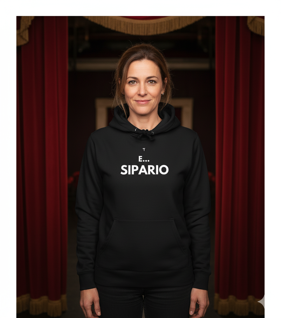"E...sipario" è una semplice frase che racchiude l'attimo di suspense prima dell'inizio dello spettacolo. Con queste due parole, si evoca l'atmosfera carica di attesa e adrenalina che precede l’apertura del sipario. Un design essenziale, ma potente, dedicato a chi vive per quei momenti magici in cui tutto può accadere sul palcoscenico. Perfetta per chi ama il teatro e l’emozione di ogni debutto, sia da attore che da spettatore appassionato.
