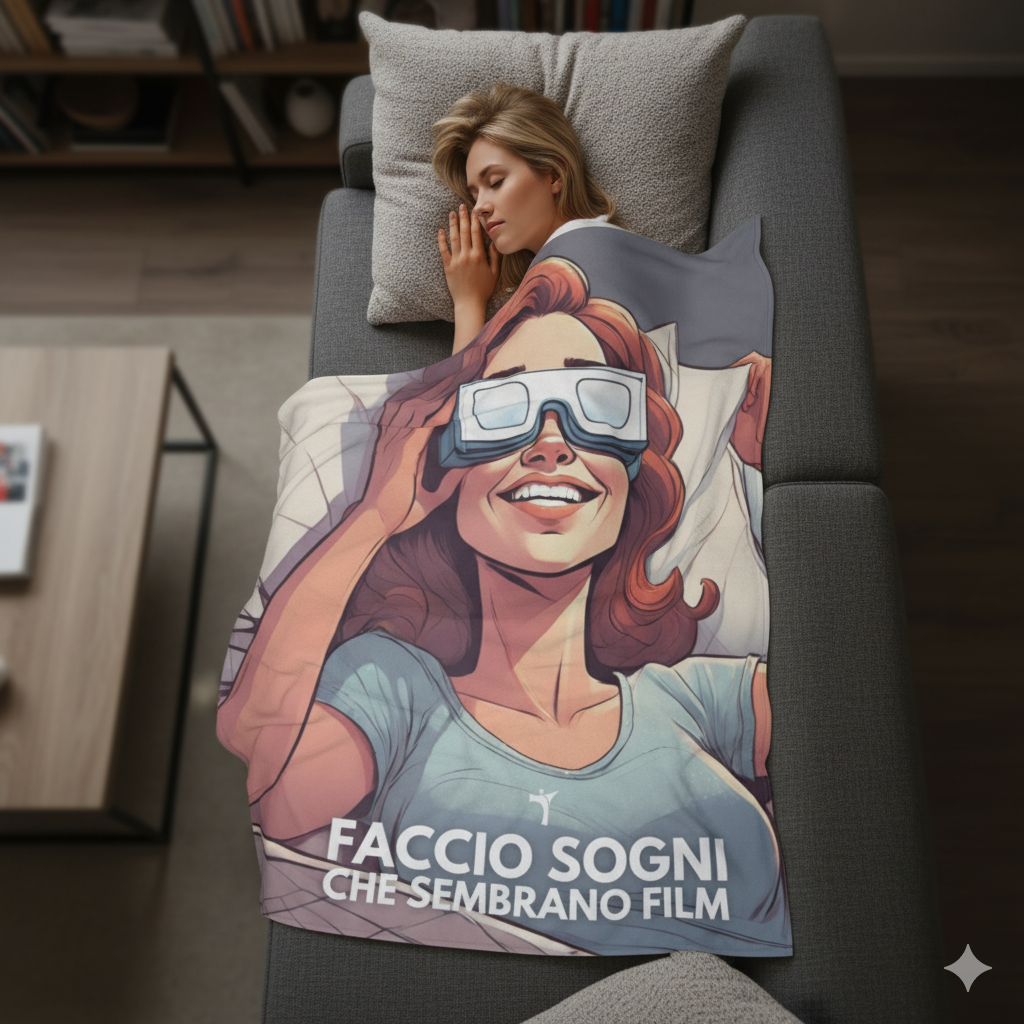 Il plaid “Faccio sogni che sembrano film” è un perfetto compagno per chi ama perdersi nei propri sogni e nelle proprie fantasie.