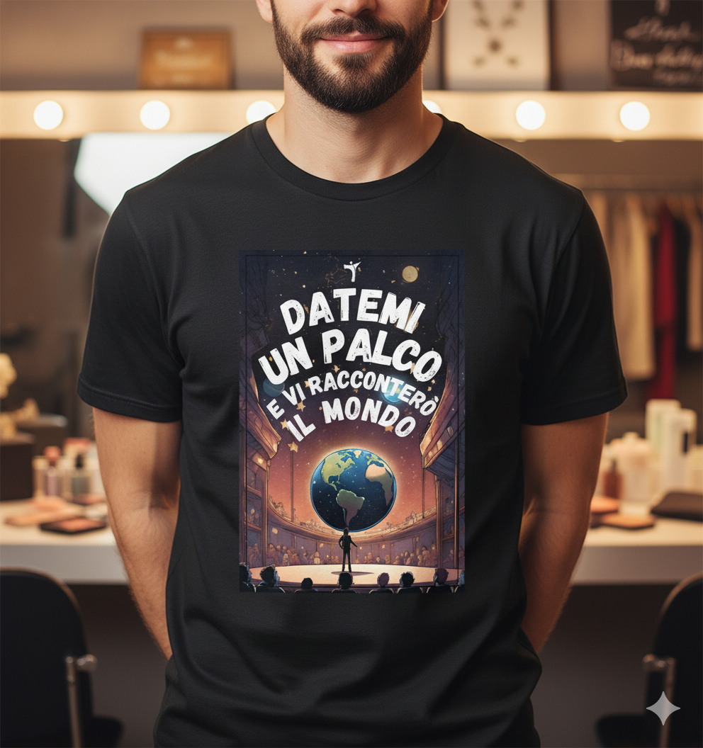 Questa grafica è un inno potente a chi vive di palcoscenico. “Datemi un palco e vi racconterò il mondo” non è solo una frase: è la promessa di ogni attore e attrice che sa trasformare una scena in un universo intero.